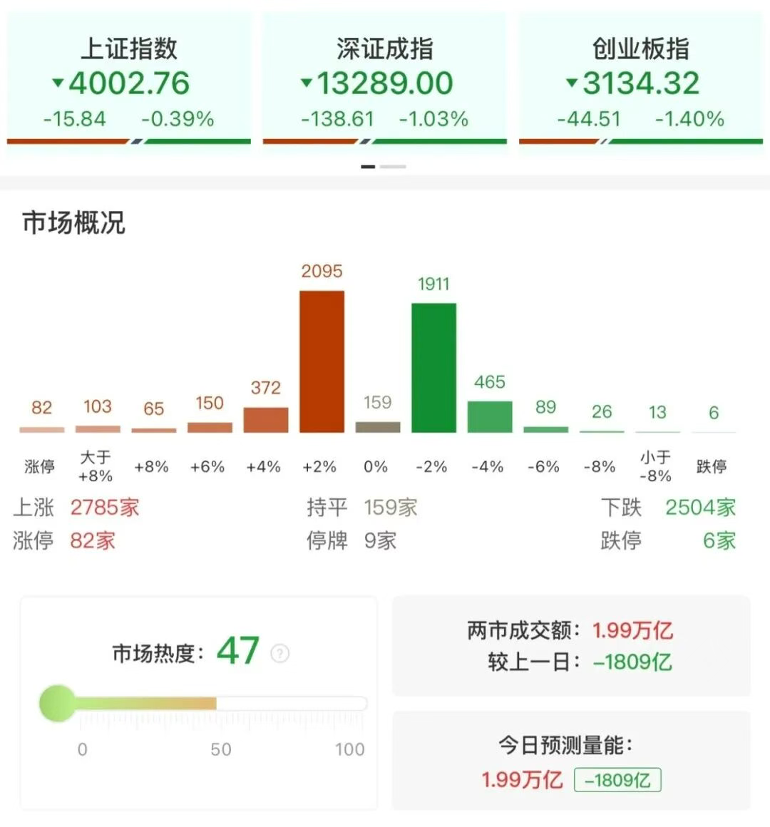 今日A股市场全天震荡调整,三大指数高开低走。沪深两市成交额不足2万亿,较上一个交易日缩量1809亿。